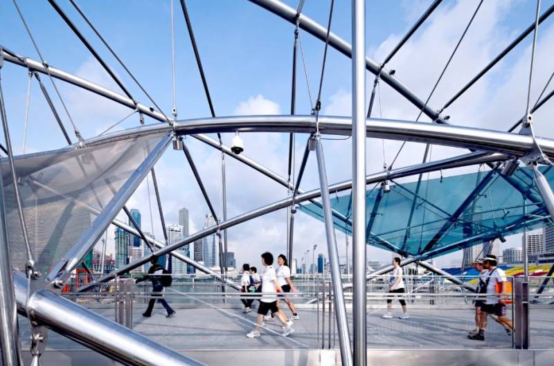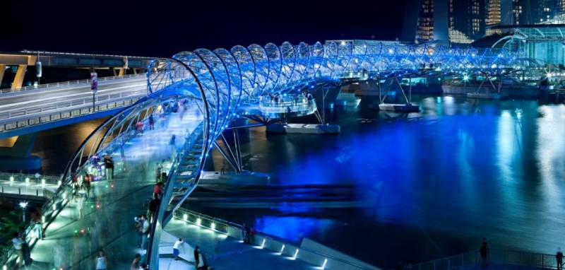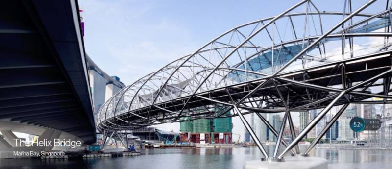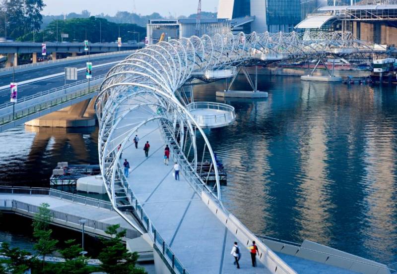 新加坡双螺旋桥是世界上首座双螺旋人行桥,位于新加坡滨海湾,衔接滨海南和滨海中。 其设计结构就像人体基因脱氧核糖核酸(DNA),由两条主钢索朝相反方向环绕而成,象征生命、延续、更新和成长,也反映新加坡人对滨海湾新市区的期待。