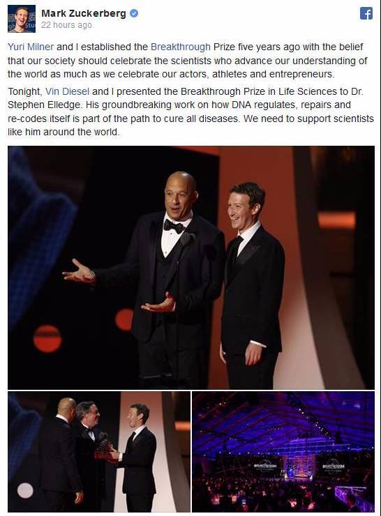 突破奖基金会由facebook创始人扎克伯格,以及Google联合创始人Sergey Brin和他的前妻Anne Wojcicki于2012年创立,意在鼓励投身于科学事业的人们~