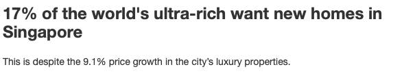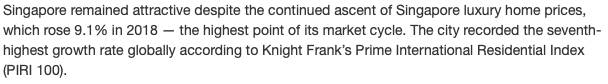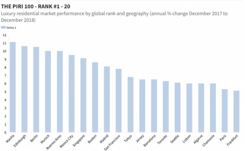 李乃佳指出,富豪购买新加坡黄金地段的住宅,除了因为这些房地产有资本增值的潜能外,新加坡安全、稳定和多元文化的都市生活,吸引他们在本地置产充作度假别墅。房价升幅最大的是马尼拉,达11.1%。紧接着是爱丁堡和柏林,升幅分别为10.6%和10.5%。最贵的是香港的豪宅,每100万美元只能买到22平方米(237平方英尺)的房子面积。