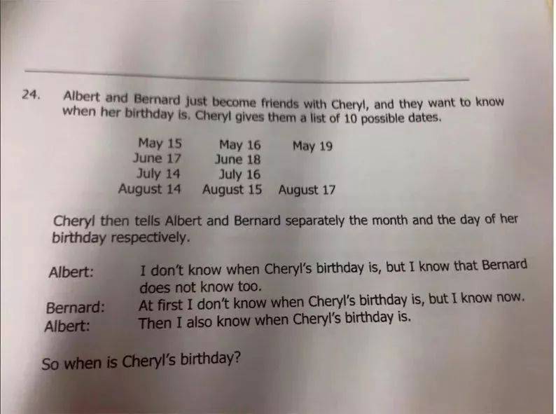 Albert和Bernard认识了一个叫Cheryl的女孩。他们想知道Cheryl的生日,Cheryl写下一张清单,上面有10个日期: