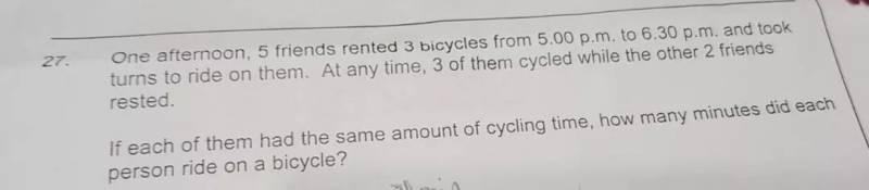 有一天下午,5个朋友租了三辆单车,从下午5点,骑到下午6点30分,期间3辆单车一直有人在骑,假设他们5人的骑车时间相同,请问每人骑一车的时间有多长?