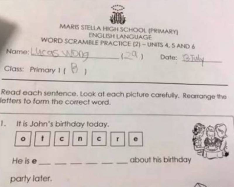 今天是John的生日,他对稍后的生日排队感到 e______.