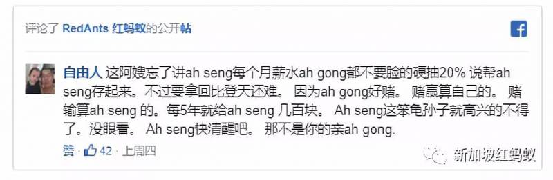 有网民也反驳说,Ah Seng并没有一味向阿公要钱,Ah Seng也有贡献,还每个月都上缴20%的薪水(意思浅浅,说的是CPF啦)给阿公保管。然而Ah Seng每次想要取回自己的血汗钱时,阿公却只给几百块敷衍Ah Seng。