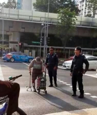 义顺市镇理事会上周四(28日)在面子书发布一段视频,一名驼背老伯一手握拐杖,一手推篮子,在交通灯前彳亍前进。行人道的交通灯已经转红,老伯还没有过完马路。两名辅警连忙上前帮忙,确保阿公平安过马路,善举博得网民一致喝彩。