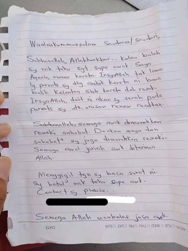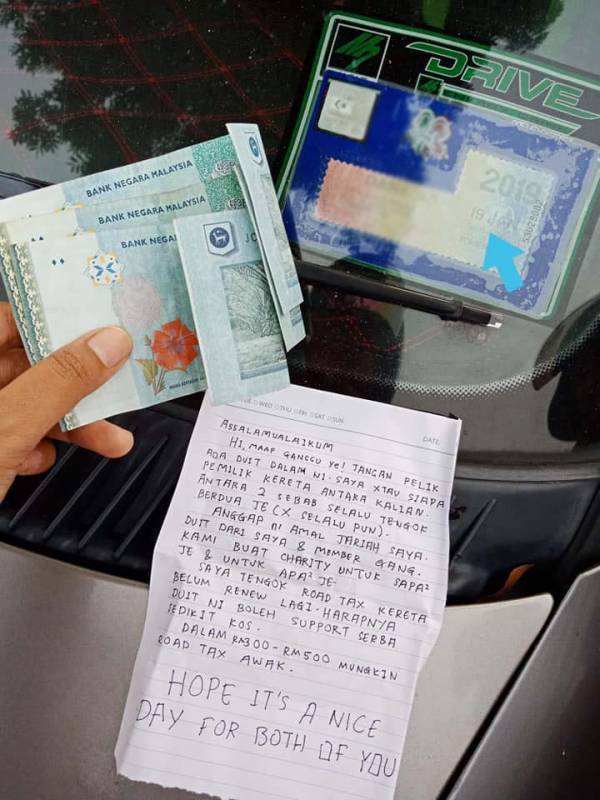 字条写着“对不起,打扰了!信封内的确是有钱,我不知车主是谁,但就当作我行善吧。我和我朋友,筹钱准备帮助需要帮忙的人。我发现你的路税逾期了,未更新。你就用这些钱去更新吧。更新路税需要300至500令吉,希望信封内的钱,可助你减经负担。”
