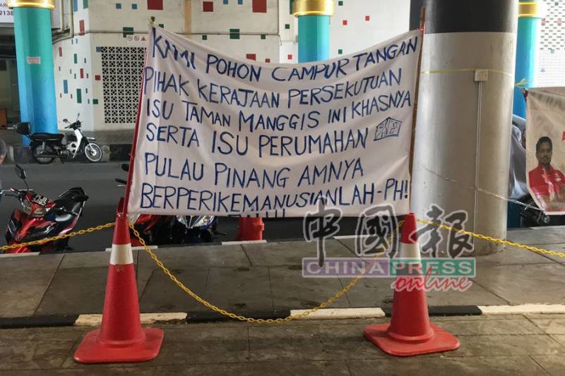 山竹园租户在光大底楼挂横幅,要求中央政府插手协助。