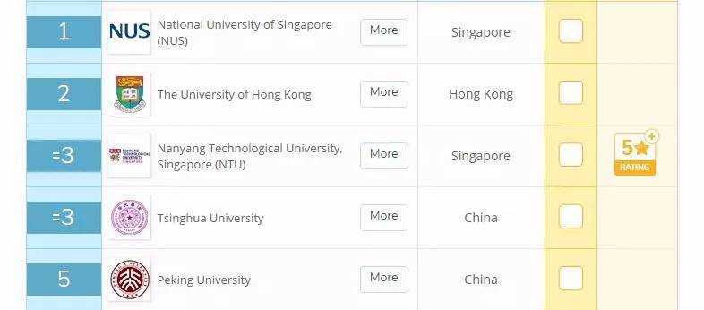 在亚洲区域的排名中,新加坡国立大学上升一位回归第一,去年排在第五的香港大学位居第二,南洋理工大学和清华大学并列第三。