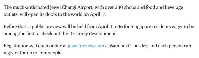 正式对外开放前,星耀樟宜(Jewel Changi Airport)将在4月11日至16之间举办预览,让国人抢先一睹这座新地标的魅力。