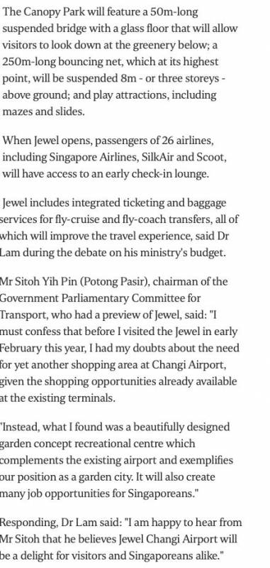 新加坡交通部兼卫生部高级政务部长蓝彬明医生昨天在国会拨款委员会辩论交通部开支预算时,宣布了星耀樟宜的开幕日期。