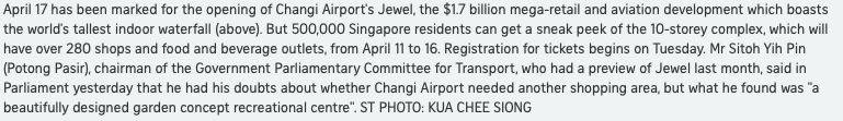 司徒宇斌也坦言,涉足星耀樟宜前,他对樟宜机场是否真有必要兴建另一个购物区有所保留。“但我发现,这是个精心设计、采用花园概念的休闲中心。它和机场相辅相成,也凸显了我国作为花园城市的地位。”