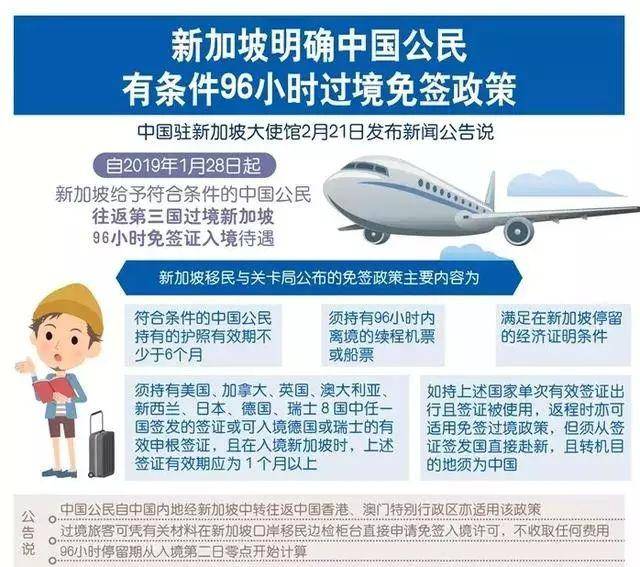 政策显示,新方对符合一定条件的中国公民实行双向96小时过境免签政策,即在前往第三国和自第三国返回途中过境新加坡时可免签停留4天。有关条件主要包括: