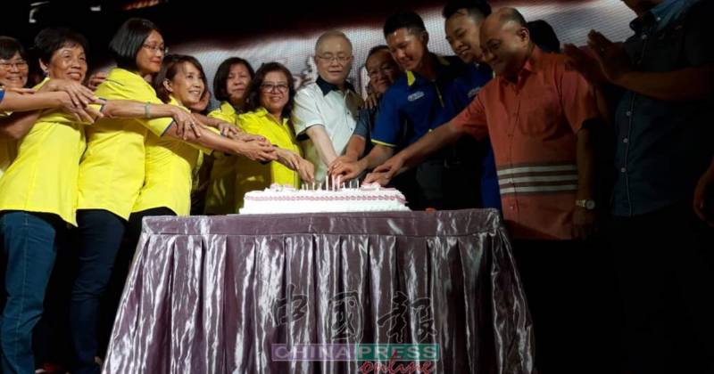 宋乃顺(右起)、赖赞发、曾伟杰、陈宝光、陈益升、魏家祥、郭运兰等人共同主持切蛋糕仪式,庆祝三八妇女节。