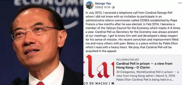 3月6日,杨荣文在Facebook上提到,他与红衣主教乔治佩尔是在2013年的时候认识,他表示自己非常了解乔治佩尔,并认为最近有关他的定罪和监禁,让人感到非常痛苦。