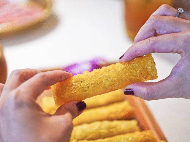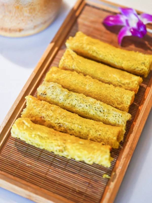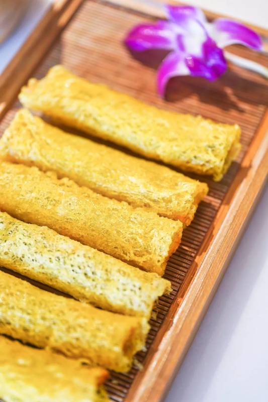 炸得酥脆的虾肉酥卷,灵感来源于粤菜里金沙肠粉的油炸酥做法。