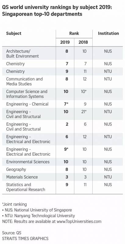 NUS入选了9个科目,分别是化学、土木工程、电子电气、建筑环境工程、化工、电脑科学和信息工程、环境科学、地理、统计及运筹学。