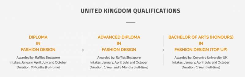 莱佛士设计学院的时装设计和时装营销专业的荣誉学士学位课程与英国考文垂大学 Coventry University 合作。修满3年本科课程后,学生会获得由考文垂大学颁发的荣誉学士学位。