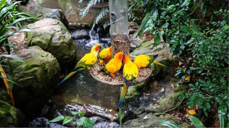 【裕廊飞禽公园】是亚洲最大的飞禽公园,它依山而建, 如瀑布鸟舍、犀鸟与巨嘴鸟展区、企鹅滩、亚洲珍禽、金刚鹦鹉岛、火烈鸟湖以及赫蕉种质资源库等。