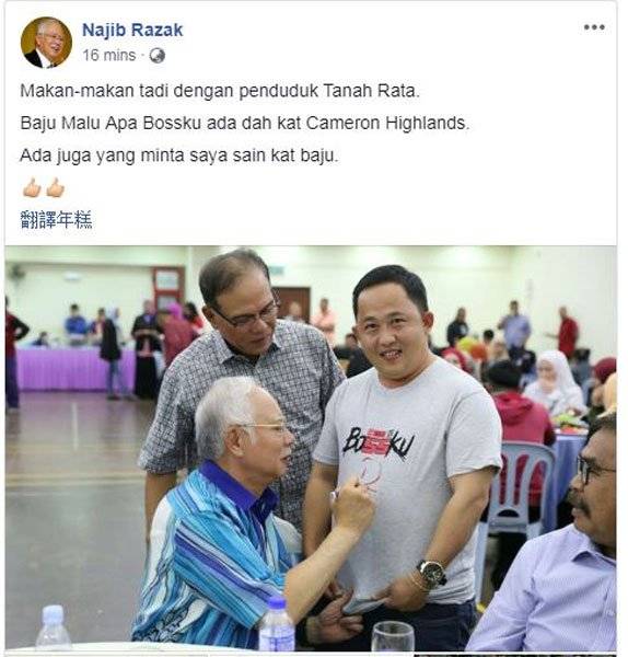 纳吉在面子书撰文指出,他今天在丹那拉打用餐时,知悉该潮语T恤已在金马仑出售,一名纳吉支持者正穿上该T恤,向纳吉索取亲笔签名。