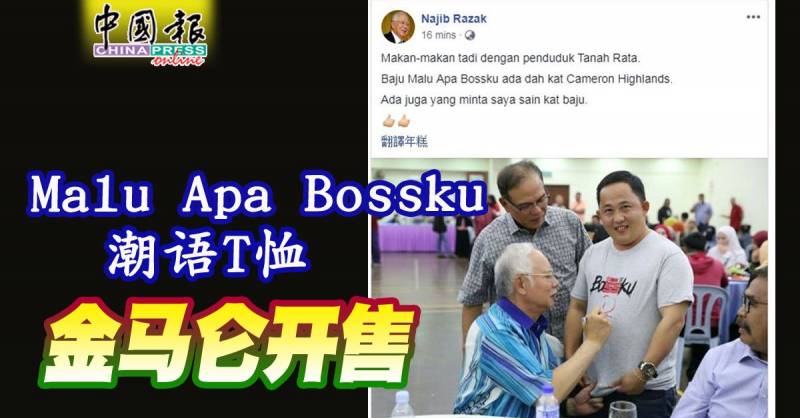 (吉隆坡9日讯)令前首相拿督斯里纳吉人气爆红的“朋友,害羞什么”(Malu Apa Bossku)潮语T恤,已在金马仑出售,1名纳吉的“粉丝”更幸运获得纳吉亲笔在衣服签名!