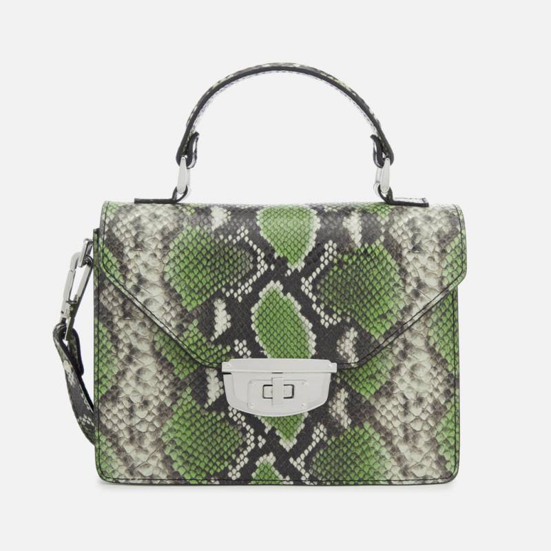 旋扣开合。内置双隔层,顶部装饰有提手以及可拆卸肩带。尺寸:17*23*10cm。