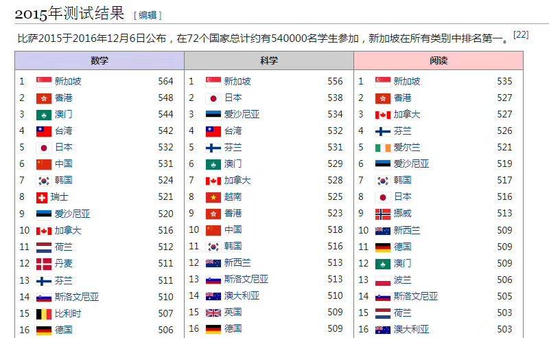 再看看OECD权威网站发布的PISA国际学生能力评估计划(每3年测一次),新加坡学生在数学、科学、阅读均世界排名第一,高出中国学生近50分。