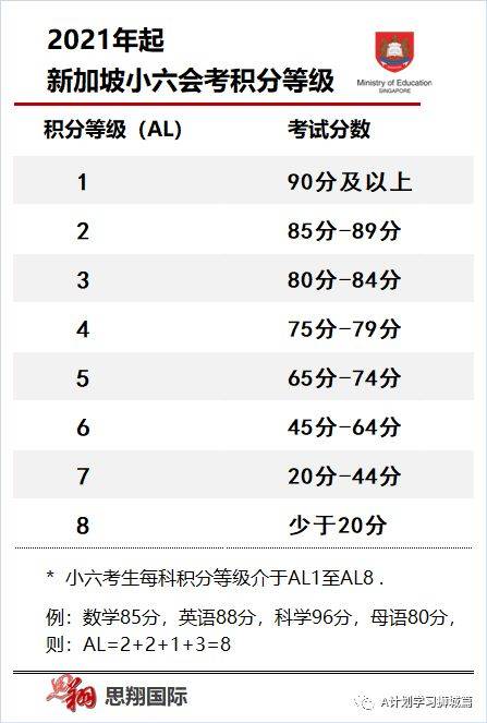2021年起,新加坡小六离校考试将采用积分等级制度(Achievement Level,简称AL),来评估学生在各个科目的学习表现。