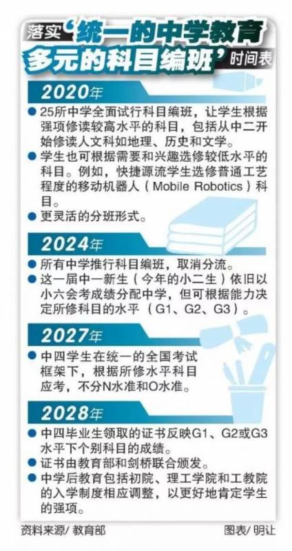 小学分流全面取消。学生可按照自己个别科目的能力来选修普通水平科目或基础水平科目。
