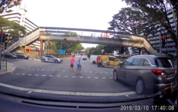 (新加坡12日讯)吓坏阿公了!轿车冲太快,驶至行人道时疑来不及停车,险些撞上越过道路的阿公,之后司机尴尬地退车让行人走,但依旧遭网民斥责:“迟多一秒,可是要了阿公的命啊!”
