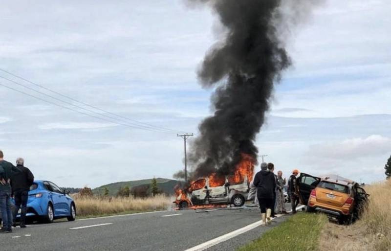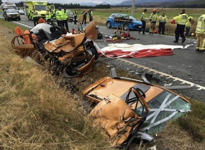 他们乘坐的银色面包车在新西兰西南部高速公路上行驶时,和载有两人的橙色SUV相撞!