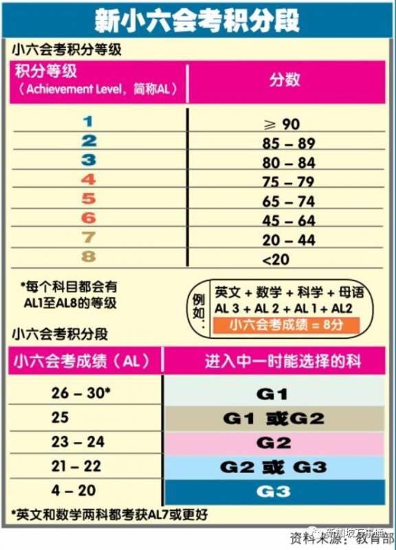 2021年起,新加坡小六离校考试将采用积分等级制度,四个科目成绩各分为1至8级,因此考生的总成绩介于最好的4分和最差的32分之间。