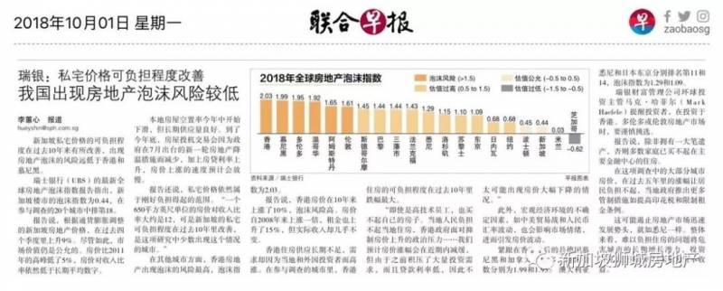 在瑞士银行的最新全球地产泡沫指数报告中,新加坡房产风险是非常低的,图源:联合早报