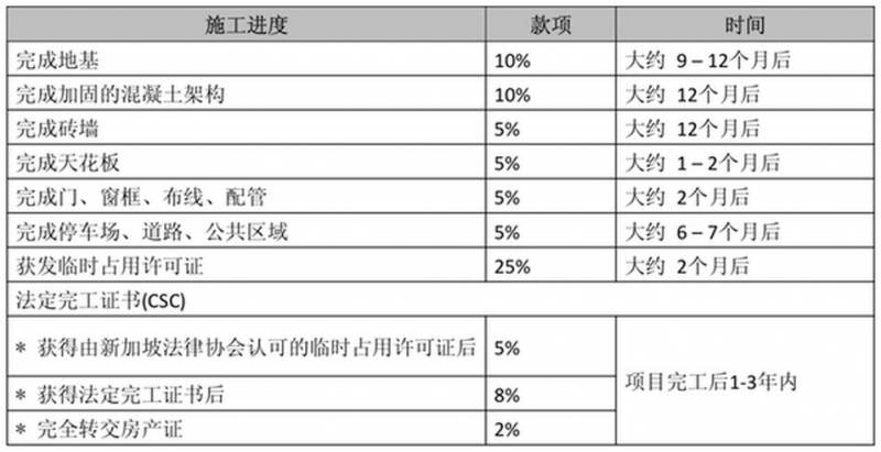 国内期房项目需付全额然后等待几年交房。新加坡期房是按工程进度分期付款的。比如在交付头期款20%和税,之后的付款流程如下: