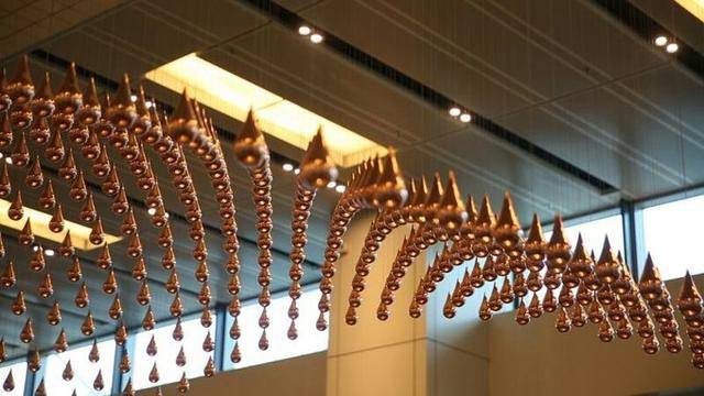 雨之舞它位于樟宜机场1号航站楼离境大厅,由1216个雨滴形状的铜珠组成的动力艺术雕塑,看起来相当有 光泽 和质感。每个水珠连结一个发动机,通过精密的操控,使空中那些像雨一样的细线,精准地变换成16种不同的形状。舒缓的悦动,优美的变换,每个形状承载着一个不同的航空的主题,如诗如幻。走近一看,它安全防护措施也做的很好,底下设有隐形的漏网防止掉落砸到行人。