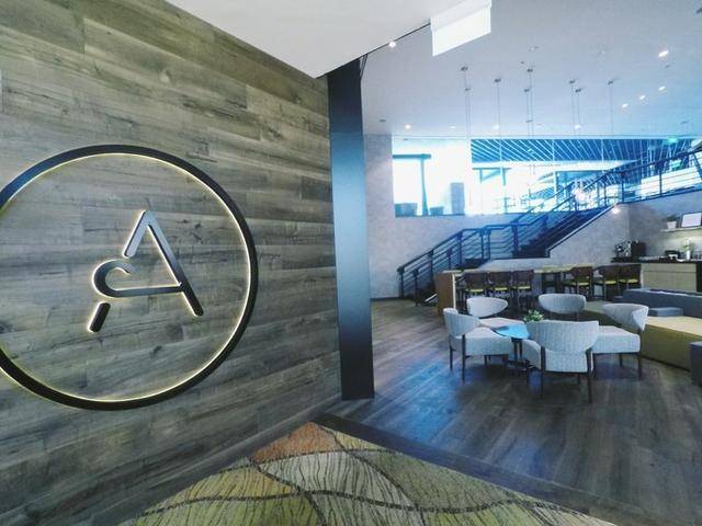 转机酒店的休息区,提供免费的咖啡与茶饮,配有电视,沙发,甚至可以在顶层游泳池畅游。
