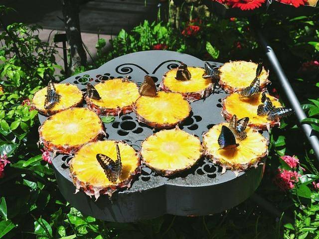 这栋高2层楼的封闭式花园为1000多只蝴蝶提供了栖息地,在这里可以看到成群结队的蝴蝶在这里翩翩飞舞。那些香甜的菠萝,吸引著蝴蝶,即使人靠的特别近,它们也不惧怕,哈哈,什么也抵挡不住这些小吃货们疯狂觅食……