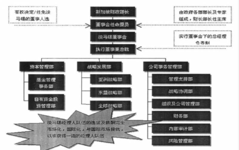 公司执行董事兼CEO由现任新加坡总理李显龙的妻子何晶女士担任。公司董事会目前共由10名董事组成。其中四名(占40%)为政府公务员,另外6名为企业界人士。根据公司章程规定,公司高层领导(董事长、总裁)的任命需经财政部复审、报总统批准,这也说明它与一般的私营公司有很大的不同。