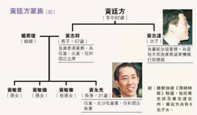 黄廷芳有两个儿子,6个女儿。长子黄志祥主要在香港活动,掌管香港房地产上市公司信和置业,小儿子黄志达则留在新加坡,协助处理远东机构的业务。