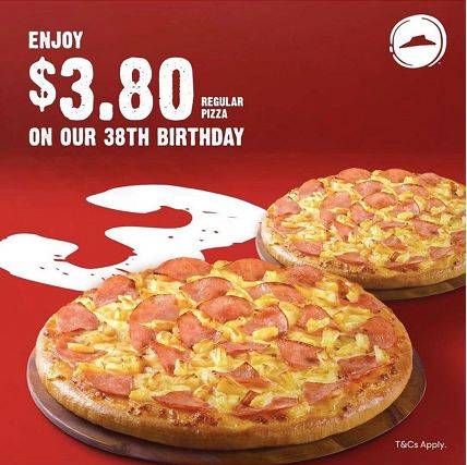 必胜客庆祝38年生日,只要购买任何主食,即可以$3.80享有披萨一个!只要在点餐时祝愿必胜客“Happy Birthday Pizza Hut”,或者线上购买时,输入促销码:YAY380PIZZA,即可享有优惠~