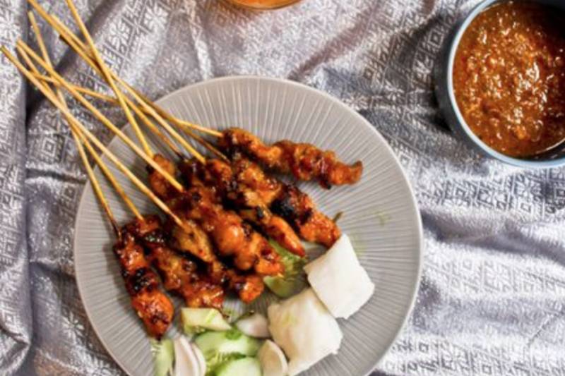 炭火烘烤后的肉串(鸡、牛或羊肉)散发出鲜香可口的香味,蘸点甜辣的花生酱。沙爹来自福建话,意思是“三块”,而每个沙爹恰巧就是三块。