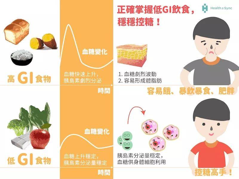 GI表示血糖生成指数,就是人在吃下这个食物后,血糖上升的指数。食物的GI值越高,越容易形成脂肪。高GI食物由于消化快、吸收率高,导致胰岛素的分泌增加,餐后血糖在短时间内快速升高,超过人体本身所需的能量,自然而然就会转变为脂肪堆积在体内。而且,高GI食物又令人短时内产生饥饿感,于是又开始吃吃吃,陷入恶性循环。