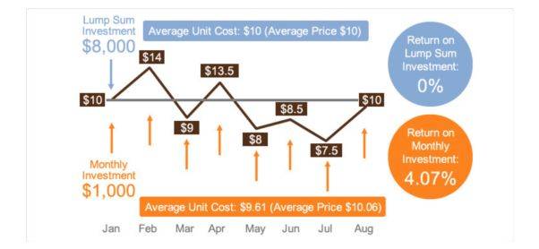 请参考下图。一次性投资8000块对比每个月投资1000块,8000块的一次性投资在8个月后平均每单位成本还是10块钱,但是每月投资1000块的投资者的单位成本为9.61元,投资回报为4.07%。