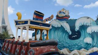 这个游戏看起来像是海盗船的升级版,除了左右摇晃以后,还有前后,所以它是一个类似“洗衣机”功能的摇晃游戏,360度转圈圈,晕车的人士请勿选择。