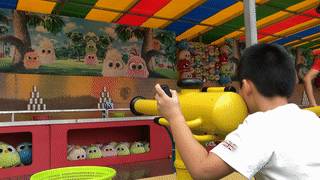 如图所示,把丘放入喷射器,对准罐头铁罐,射准目标可以选取奖品,把那些可爱的娃娃抱回家。
