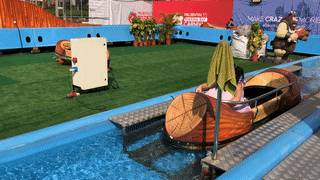 一艘船可以坐2个小朋友,游船一圈的时间大概是2分钟,速度缓慢,船是顺着河流的速度来“飘”著。