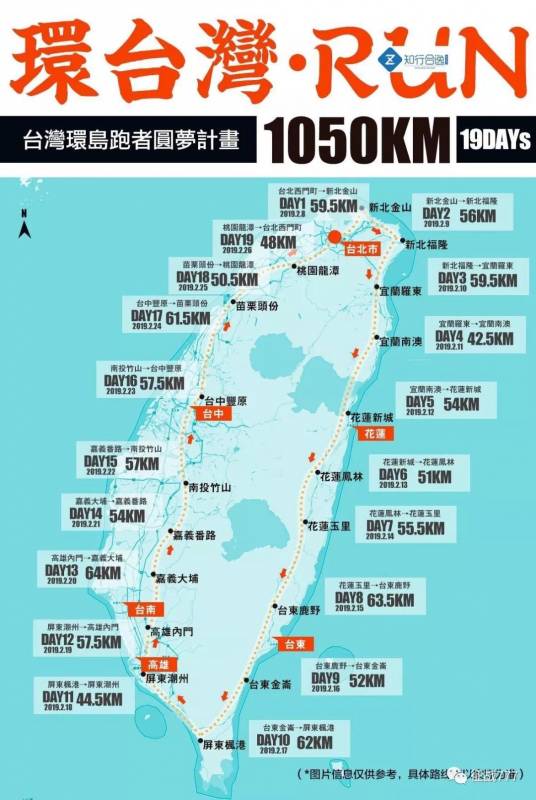 这场激动人心而又艰苦卓绝的台湾环岛跑者圆梦计划于2019年2月8日(大年初四)从西门町出发,以顺时钟方向跑步环台湾岛而行,全长1045公里需要19天完成。每天赛程最少42.5公里,最多64.5公里;赛道最高有两千多米的爬升;赛会要求选手每小时最低时速不得低于5公里并设有关门时间。可以说是最虐的超级马拉松赛事之一!