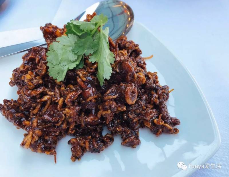 油炸小苏东。其实就是油炸的小墨斗鱼,黑黑小小一颗,没什么卖相。炸的酥脆,糖油在表面结成晶体,是一道高油高碳水的下酒菜。