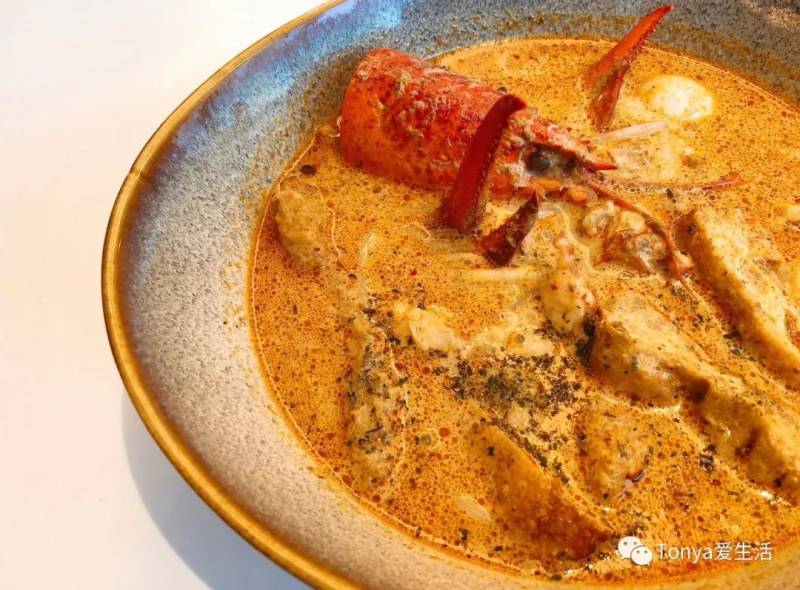 餐厅的龙虾叻沙也是非常有名,据说去晚了就没有了。从色泽就可知汤头十分浓郁,一只波士顿龙虾在表面做出蓄势待发的模样。米粉爽滑,鹌鹑蛋、豆腐和鱼饼吸饱了微辣的椰浆汤底,十分入味。