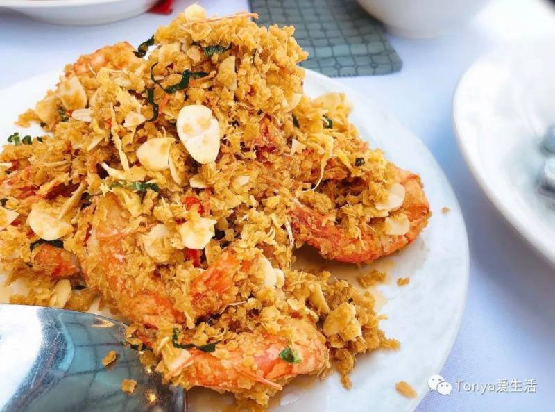 麦片虾率先上桌。新鲜的海虾过油略炸,后加入燕麦和杏仁片与黄油炒制,过程中加入了炼乳。黄油香气中混杂着奶香,麦片厚厚地包裹于虾身,麦片与大虾一同炸得酥脆,连虾壳虾头也可以一起嚼著下肚。