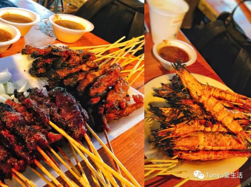 沙爹肉串(Satay)是新马本地的特色烧烤,有鸡、鸭、牛、羊和海鲜等选择。一份足有二三十串,一不小心就点多了。烧烤时刷上了层层沙茶酱,调味甜腻,搭配冰啤食用口感更佳。