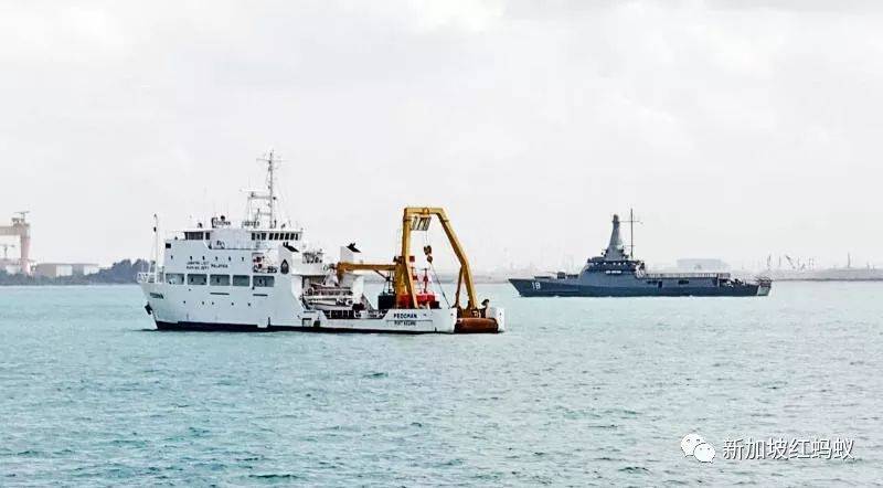今年1月间,新加坡海军部队巡海护卫舰正义号(RSS Justice,右)密切留意停泊在新加坡港界范围内的马来西亚海事部船只Pedoman号(左)。(新加坡警察部队提供)